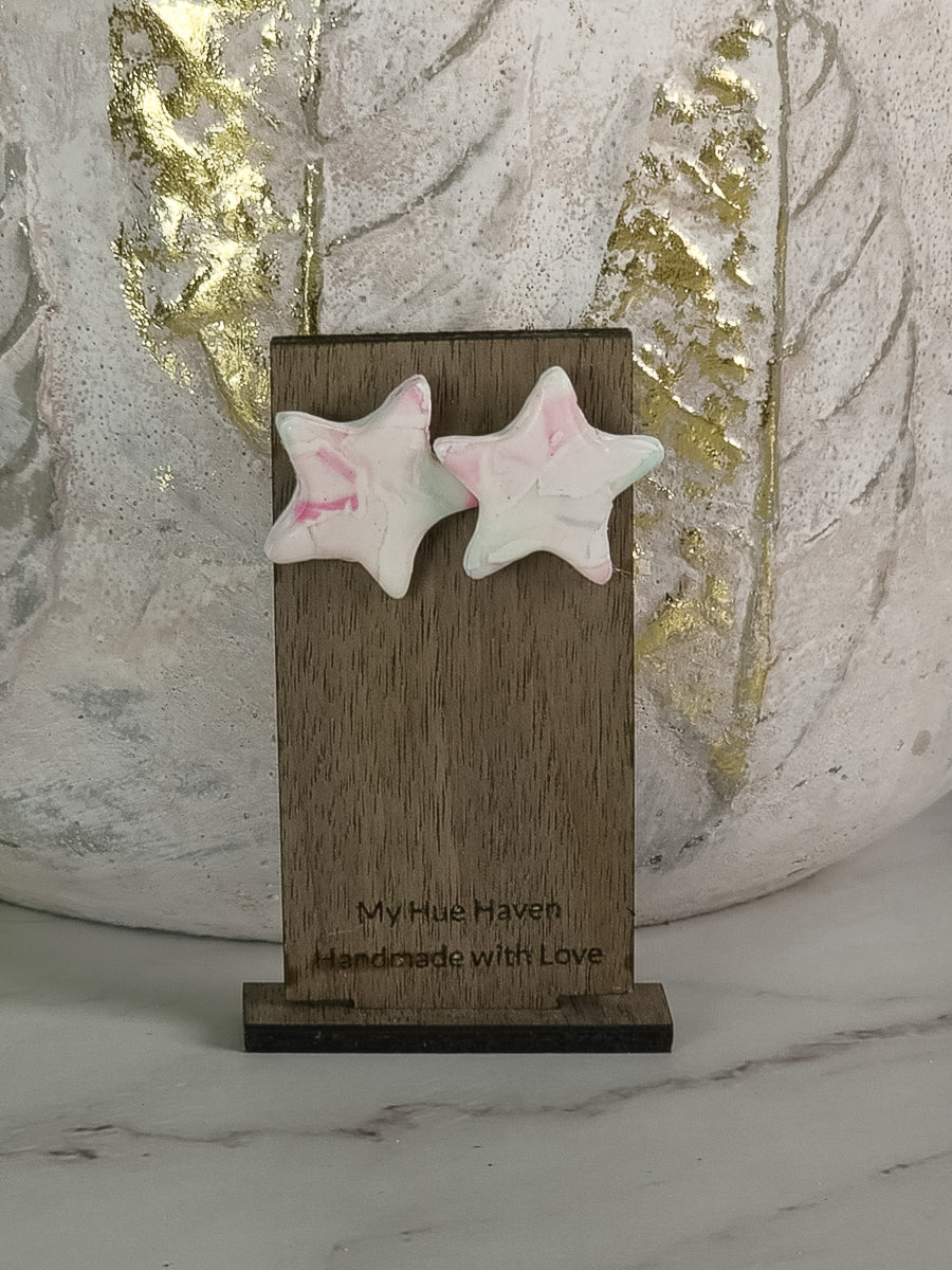 Experience the whimsy and charm of our star shaped pink polymer clay stud earrings with hints of green! Handcrafted with love and care, these earrings add a fun and feminine touch to any outfit. Measuring about 1" in diameter, they are the perfect size for everyday wear. Truly a unique and eye-catching addition to your jewelry collection.