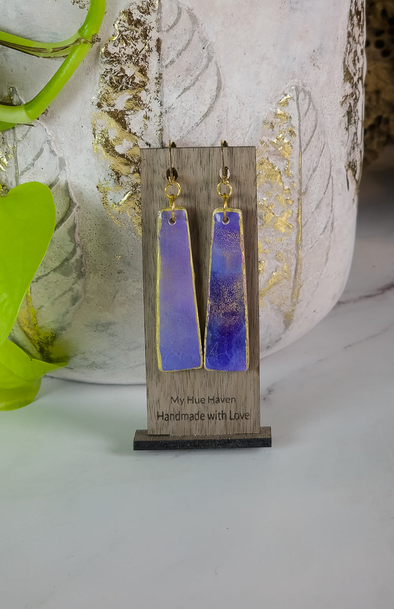 Unleash your inner goddess with Belle earrings! These stunning purple and gold polymer clay earrings, measuring about 3", will add a touch of elegance and sophistication to any outfit. Handcrafted with care, they are lightweight and comfortable to wear, making them the perfect accessory for any occasion. Make a statement and stand out from the crowd with Belle.