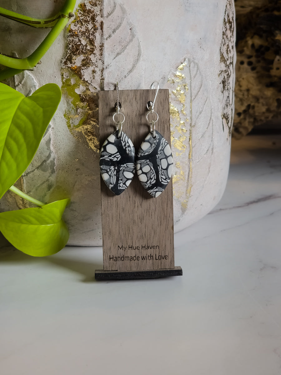 Elevate your accessory game with our unique and limited edition polymer clay earrings. Measuring just over two inches, these black and white statement pieces are truly one of a kind. Get your hands on one of the only two pairs made!