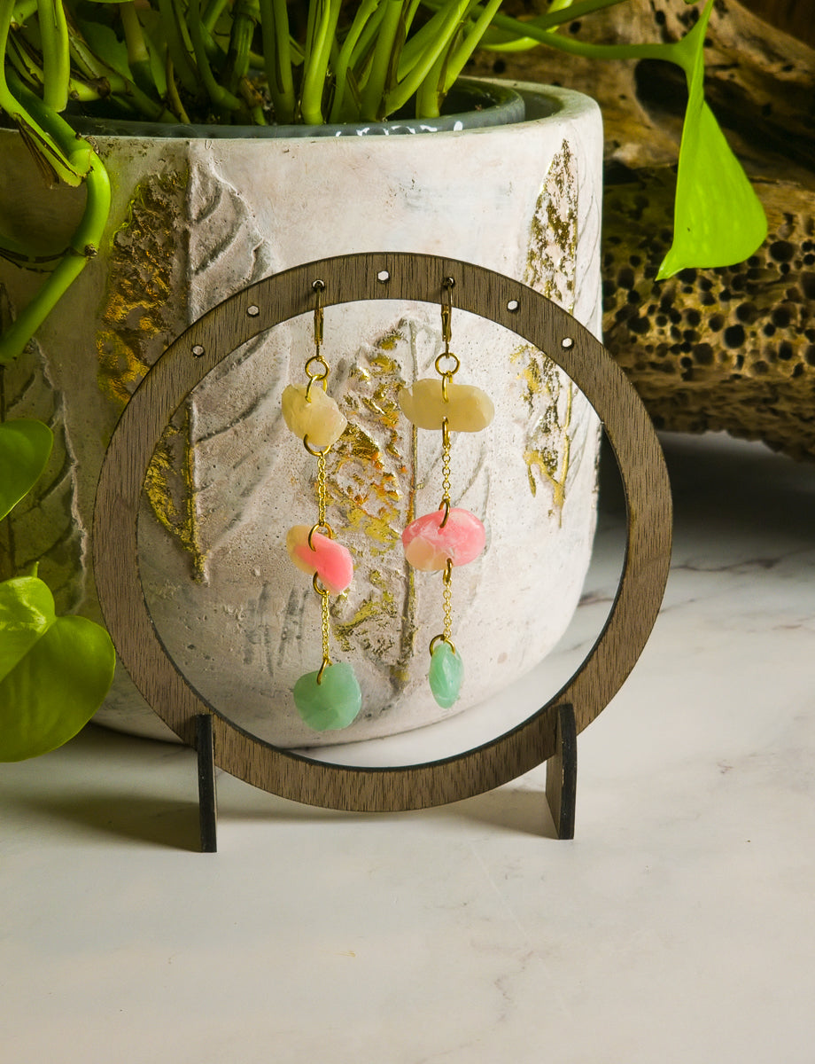Elevate your beach style with our stunning Beaches Collection earrings! These statement pieces feature three hand-crafted polymer clay stones in a dreamy white, soft pink, and ocean-inspired blue-green. Measuring at 3.5 inches long, they are the perfect accessory for a day at the beach or a night out on the town. Add a touch of coastal charm to any outfit with these unique and beautiful earrings!