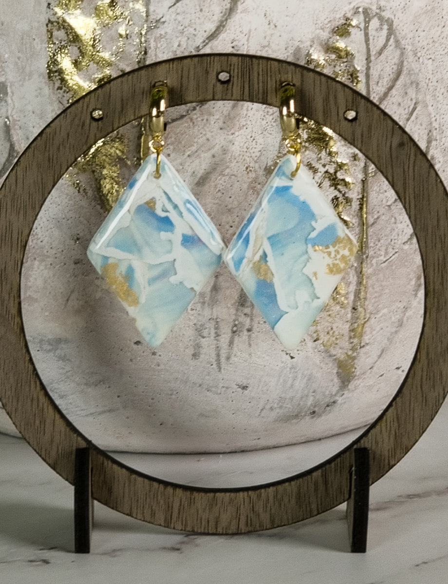 Elevate your style with Tatiana earrings! The perfect blend of blue, white, and gold polymer clay creates a stunning, unique design that measures about 2 inches. Add a touch of color and elegance to any outfit with these lightweight, eye-catching earrings.